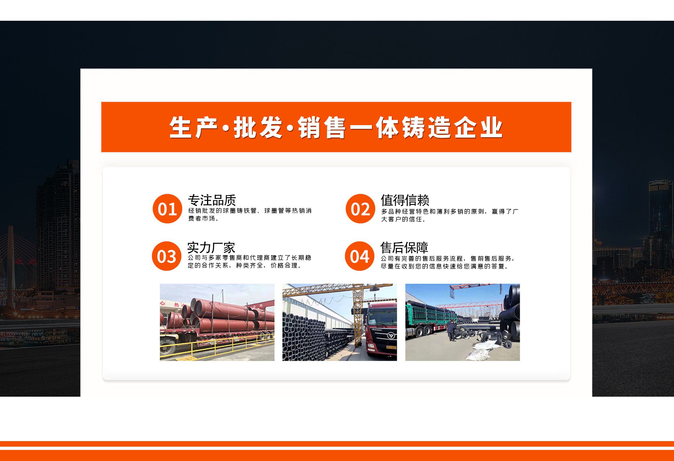 青島金源達管業(yè)有限公司主要經(jīng)營各種規(guī)格球墨鑄鐵管,球墨管,球墨鑄鐵管廠家等產(chǎn)品,質(zhì)量可靠,誠信經(jīng)營,值得信賴! 青島金源達管業(yè)有限公司始終堅持“誠信立業(yè),追求卓越,合作共贏,共同發(fā)展”,竭誠歡迎各界朋友來廠參觀指導(dǎo),洽談業(yè)務(wù)。我們愿與您攜手共進,互惠雙贏,共創(chuàng)未來! 公司堅持“以奮斗者為本”的理念,關(guān)心關(guān)愛職工,職工的獲得感、幸福感更加充實、更有保障、更可持續(xù);秉承“忠誠企業(yè)、勇于擔當、開拓創(chuàng)新、主動作為”,堅持黨建領(lǐng)航、創(chuàng)新驅(qū)動、文化塑魂、奉獻社會,全面致力于綠色、低碳、高效、高質(zhì)量發(fā)展?! ≡概c各界朋友攜手并進,共創(chuàng)未來!...
